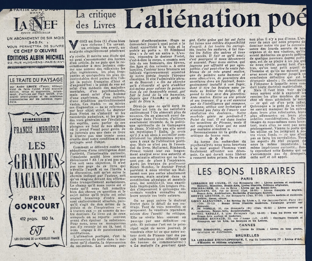 Απόκομμα εφημερίδας, έντυπο, στα γαλλικά, χαρτί, 2 όψεις, 23×26 εκ. Το απόκομμα εικονογραφείται. Στο κάτω μέρος του τεκμηρίου, επιγραφή με στοιχεία έκδοσης.
