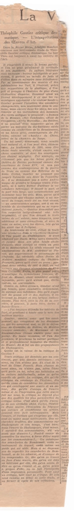 Απόκομμα, έντυπο, χαρτί, 51,0×26,5 εκ., όπου δημοσιεύεται, στα γαλλικά, απόσπασμα κειμένου του Adolphe Boschot για την κριτική δραστηριότητα του Γάλλου ποιητή και λογοτέχνη Théophile Gautier. Στην ίδια σελίδα δημοσιεύονται επίσης τα άρθρα: H.C. “Le Centenaire de Léon Gautier” και “Littérature Mystique”. Στην άλλη σελίδα, απόσπασμα άρθρου για τον Ιταλό ζωγράφο της Αναγέννησης Σάντρο Μποτιτσέλι με αφορμή την έκδοση της σχετικής μονογραφίας του Marchel Brion και κριτική του βιβλίου του Maurice Kunel με τίτλο “Cinq Journées avec Ch. Baudelaire”.