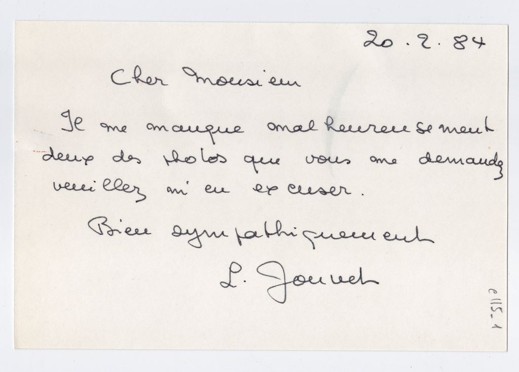Κάρτα, χαρτόνι, μία όψη, 10,0×14,8 εκ., με χειρόγραφο σημείωμα του L. Jouvel προς τον Τώνη Σπητέρη που τον ευχαριστεί για την αποστολή φωτογραφιών.