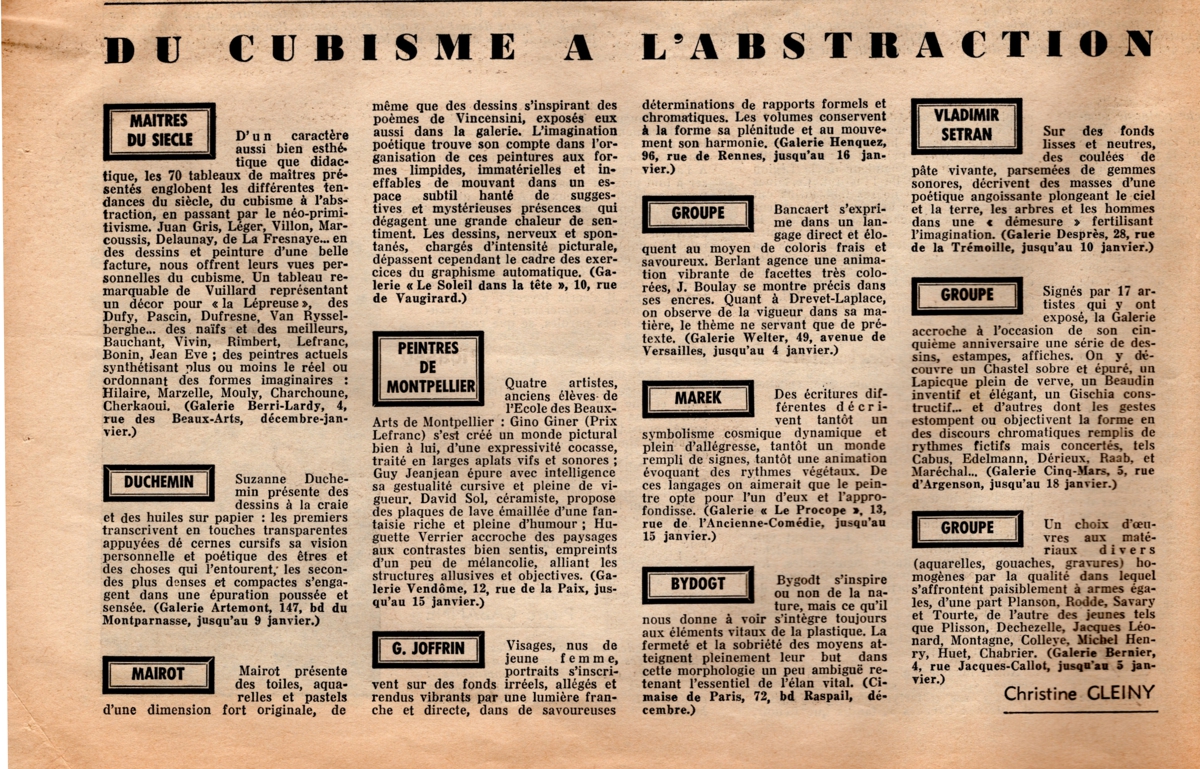 Απόκομμα, έντυπο, χαρτί, 42,5×28,8 εκ., όπου δημοσιεύεται, στα γαλλικά, κριτική της Christine Cleiny για τις ατομικής και ομαδικές εκθέσεις της περιόδου στο Παρίσι. Στην ίδια σελίδα δημοσιεύεται το άρθρο του Jean-Jacques Leveque “Promenez-vous avec eux”. Σε άλλες σελίδες του τεκμηρίου δημοσιεύονται τα άρθρα: Pierre Cabanne “Bouguereau. Pourquoi pas lui?”, “Charité bien ordonnée”, “Un peintre en 4 livres”.