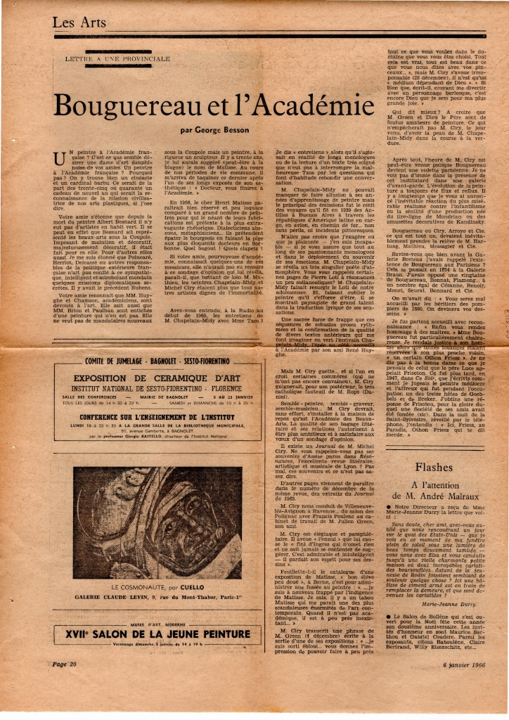 Απόκομμα, έντυπο, χαρτί, 42,4×30,3 εκ., όπου δημοσιεύεται, στα γαλλικά, άρθρο του George Besson για τον Γάλλο ζωγράφου William Bouguereau με αφορμή την έκθεση έργων του στο Παρίσι το 1965/66. Στην ίδια σελίδα δημοσιεύονται αναγγελίες εκθέσεων της περιόδου. Στην άλλη σελίδα δημοσιεύονται τα άρθρα: Pierre Descargues “Livres de luxe d’aujourd’hui”, Marc Albert-Levin “De Lopez (USA) à Roanji (Japon) en passant par Varengeville (France) και Jacques Massol “Flashes”.