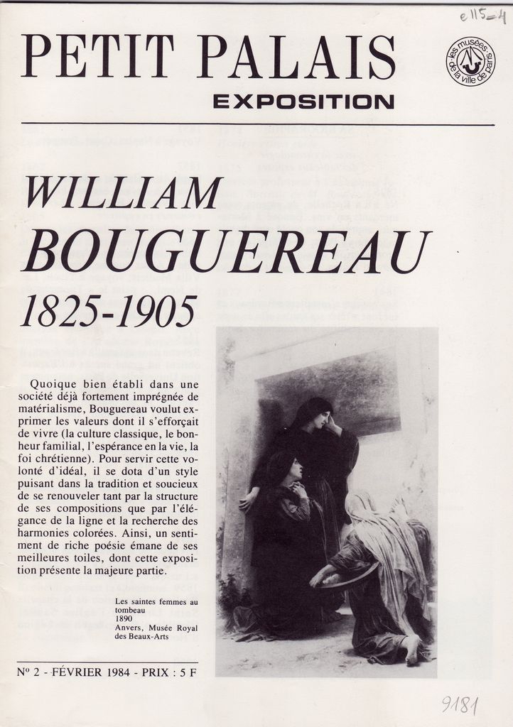 Έντυπο, στα γαλλικά, χαρτί ιλουστρασιόν, οκτασέλιδο, 22,0×16,0 εκ. Κατάλογος της αναδρομικής έκθεσης έργων του Γάλλου ζωγράφου William Bouguereau που διοργανώθηκε στο Παρίσι το 1984. Περιλαμβάνει σύντομο βιογραφικό και κείμενα του επιμελητή της έκθεσης Gilles Chazal για τη ζωή και το έργο του καλλιτέχνη. Κάτω δεξιά, επιγραφή.