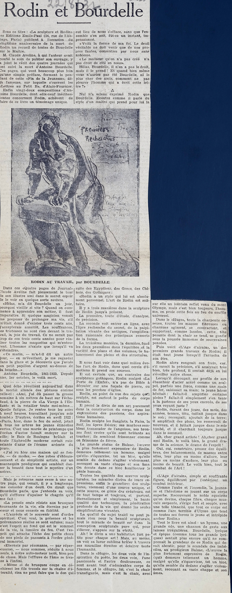 Απόκομμα, χαρτί ακανόνιστου μεγέθους, στα γαλλικά, δημοσίευσης άρθρου το οποίο αναφέρεται σε κυκλοφορία βιβλίου του Antoine Bourdelle για τον Auguste Rodin. Δίνονται πληροφορίες και αποσπάσματα.