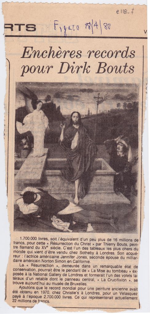 Απόκομμα, χαρτί, 22×10 εκ., στα γαλλικά, δημοσίευσης άρθρου το οποίο αναφέρεται σε δημοπρασία έργου του Dirk Bouts. Πρόκειται για το έργο του με τίτλο “Résurrection du Christ”, το οποίο πωλήθηκε πρς 16 εκατ. φράγκα και αποκτήθηκε από Αμερικάνα ηθοποιό. Δίνονται σχετικές λεπτομέρειες.