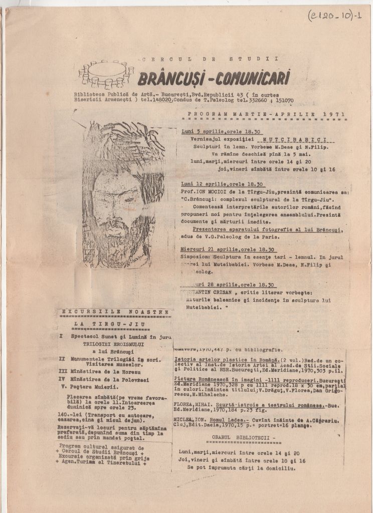 Δακτυλόγραφο έντυπο, χαρτί διπλής όψης, 29×21 εκ., στα ρουμάνικα και αγγλικά, το οποίο κυκλοφορεί από το Cercul de Studii Brancusi στο Βουκουρέστι. Περέχει πρόγραμμα εκδηλώσεων για τον Constantin Brancusi και βιβλιογραφία για τη ζωή και το έργο του καλλιτέχνη, στο πλαίσιο τεκμηρίωσης υλικού γι’ αυτόν.