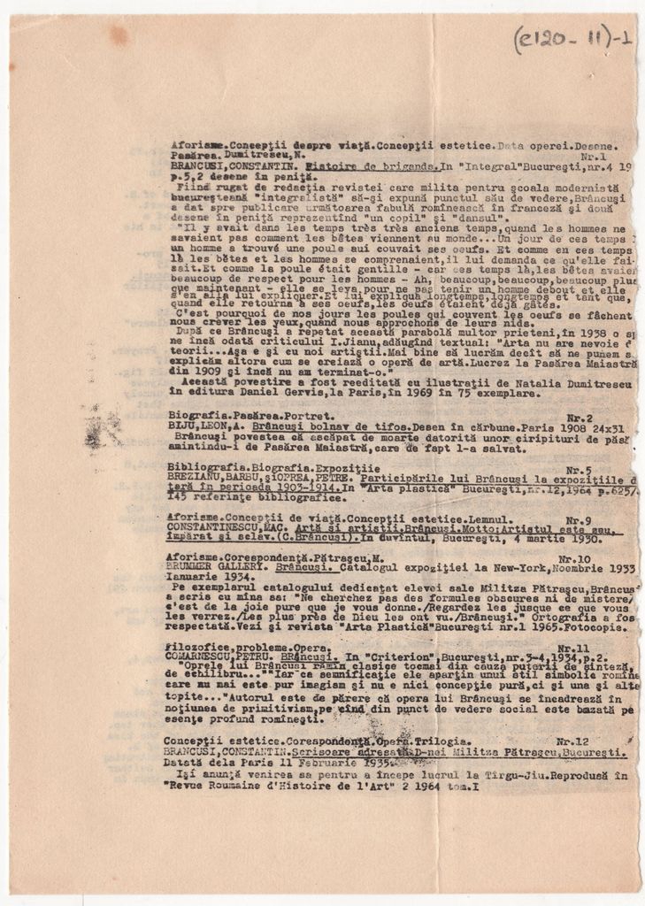 Δακτυλόγραφη βιβλιογραφία, χαρτί, 11 φφ διπλής όψης, στα ρουμάνικα και γαλλικά για τον Constantin Brancusi. Κυκλοφορεί από το Cercul de Studii Brancusi στο Βουκουρέστι.
