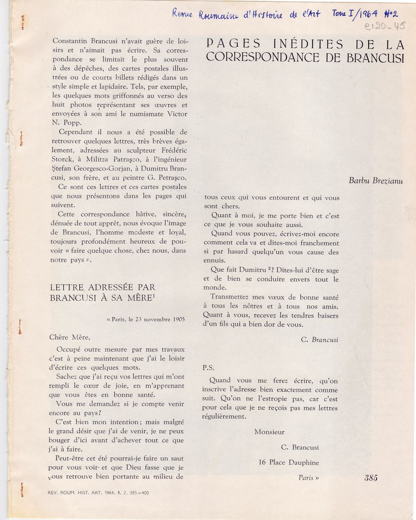 Απόκομμα, χαρτί διπλής όψης, 8 φφ, 26×20.5 εκ., στα γαλλικά, δημοσίευσης κειμένου το οποίο αναφέρεται στην αλληλογραφία του Constantin Brancusi. Δίνονται αποσπάσματα επιστολών ή ταχυδρομικών καρτών προς τη μητέρα του και φιλικά πρόσωπα ή καλλιτέχνες.