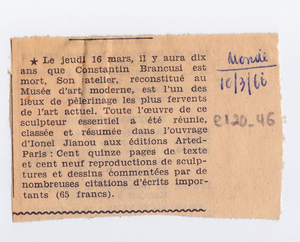 Απόκομμα, χαρτί, 5×7 εκ., στα γαλλικά, δημοσίευσης άρθρου το οποίο αναφέρεται στην κυκλοφορία έκδοσης βιβλίου του Constantin Brancusi από τον Ionel Jianou.