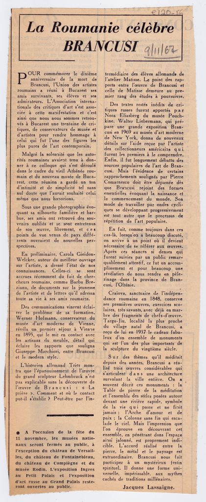 Απόκομμα, χαρτί, 26×10.5 εκ., στα γαλλικά, δημοσίευσης άρθρου το οποίο αναφέρεται σε συνέδριο αφιερωμένο στον Constantin Brancusi, που διεξάγεται στο Βουκουρέστι. Δίνονται πληροφορίες για τη διοργάνωση.