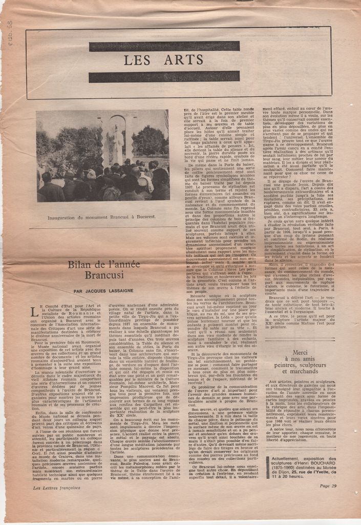 Απόκομμα, χαρτί, 42×30 εκ., στα γαλλικά, δημοσίευσης άρθρου το οποίο αναφέρεται σε εκδηλώσεις που διεξάγονται για να τιμήσουν την επέτειο συμπλήρωσης 10 χρόνων από τον θάνατο του Constantin Brancusi. Οι εκδηλώσεις διεξάγονται σε μουσεία και πολιτιστικούς χώρους στο Βουκουρέστι. Ειδικότερα, αναγράφεται ομαδική έκθεση Ρουμάνων καλλιτεχνών στο Εθνικό Μουσείο της Ρουμανίας, συνέδριο αφιερωμένο στον καλλιτέχνη, ανοικτές εκδηλώσεις για το κοινό στη γενέτειρα του καλλιτέχνη, κυκλοφορίες εκδόσεων.