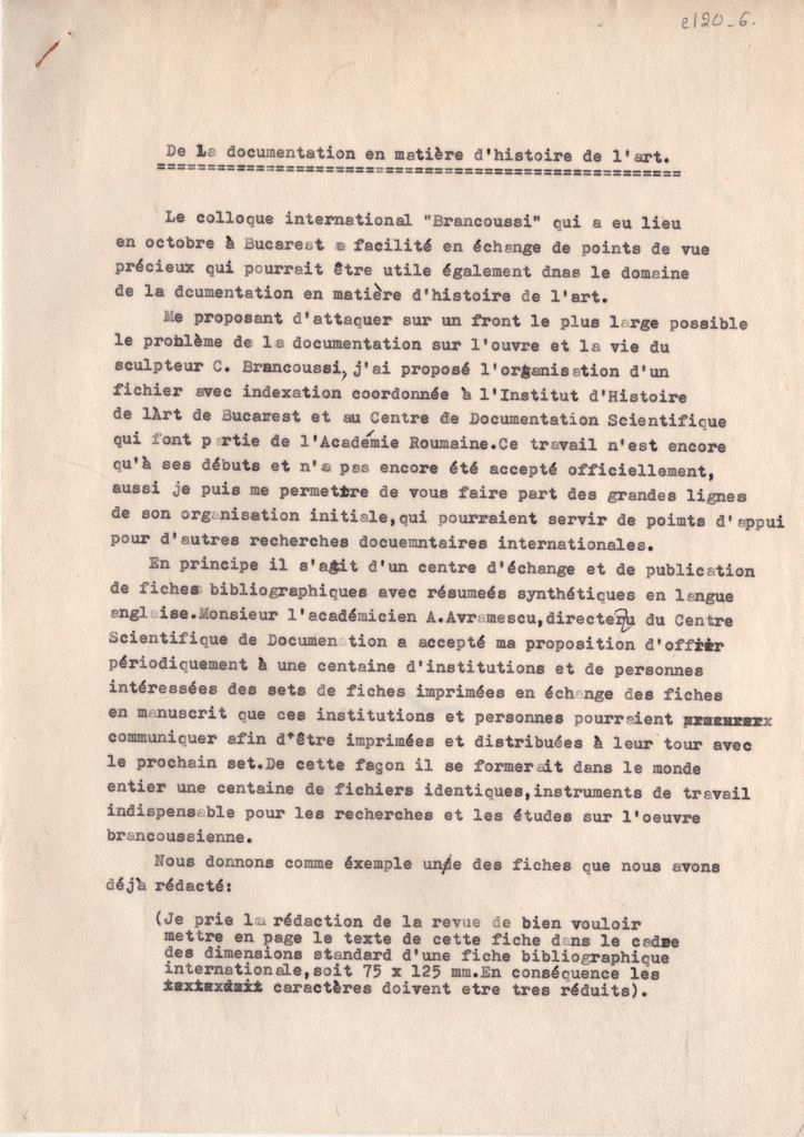 Δακτυλόγραφο κείμενο, χαρτί, 21 φφ, 30×21 εκ., στα γαλλικά, του Tretie Paleolog στο οποίο αναγράφει προτάσεις για την τεκμηρίωση του έργου του Constantin Brancusi, στο πλαίσιο του συνεδρίου Brancussi, που πραγματοποιήθηκε στο Βουκουρέστι τον Οκτώβρη 1967.