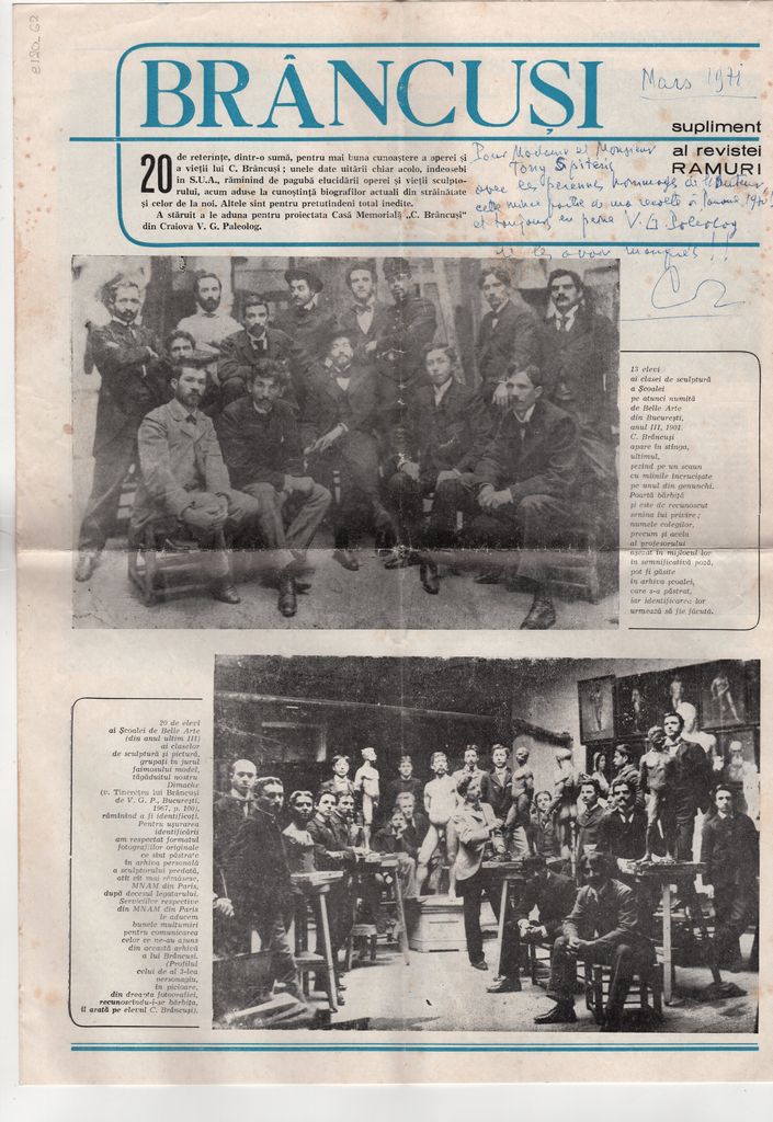 Έντυπο, ένθετο της εφημερίδας “Ramuri”, χαρτί 2 φφ διπλής όψης, 42×30 εκ., στα ρουμάνικα αφιερωμένο στον Constantin Brancusi.