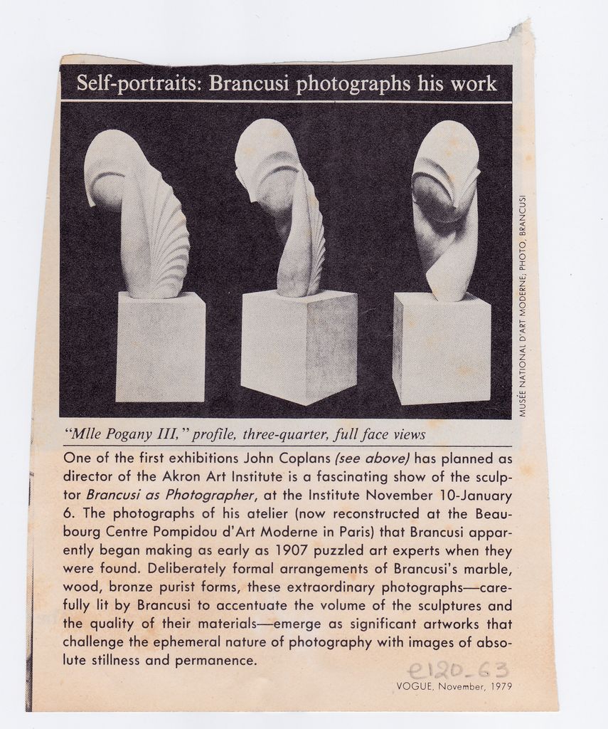 Απόκομμα, χαρτί, 10×13.5 εκ., στα αγγλικά, δημοσίευσης άρθρου αναφερόμενου σε έκθεση φωτογραφιών έργων του Constantin Brancusi, τις οποίες τράβηξε ο ίδιος, η οποία διεξάγεται στο Akron Art Institute στην Αμερική.