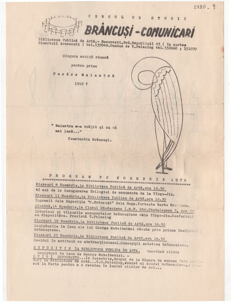 Δακτυλόγραφο έντυπο, χαρτί διπλής όψης, 29×21 εκ., στα ρουμάνικα, το οποίο κυκλοφορεί από το Cercul de Studii Brancusi στο Βουκουρέστι. Αναγράφεται πρόγραμμμα εκδηλώσεων για τον Constantin Brancusi.