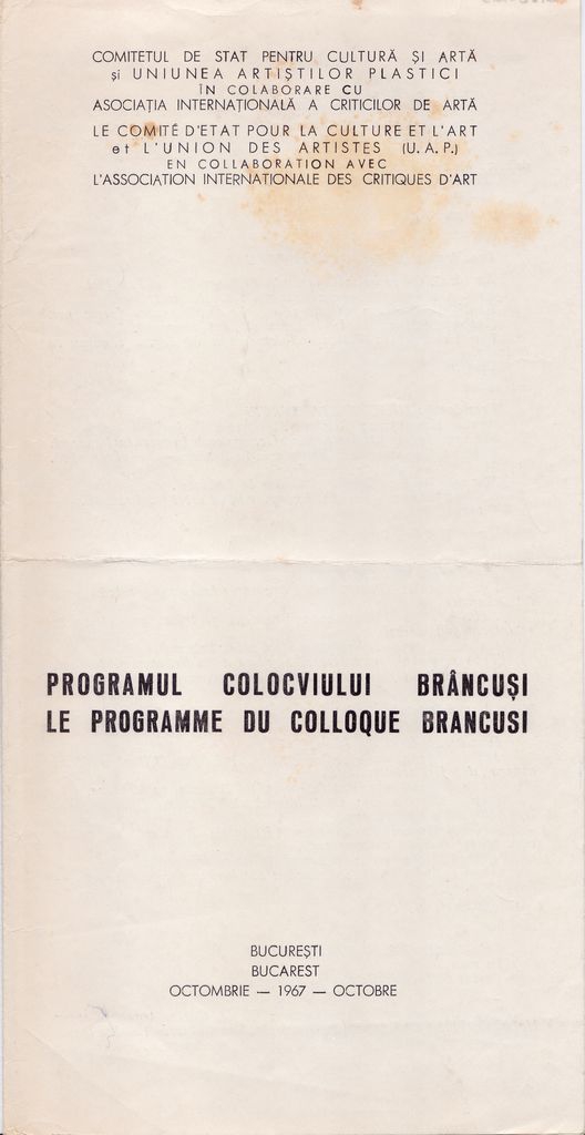 Πρόγραμμα, χαρτί αναδιπλωμένο, 30×15 εκ., στα ρουμάνικά και γαλλικά, των εργασιών του συνεδρίου Constantin Brancusi. Αναγράφονται οι εργασίες των 14 & 15 Οκτωβρίου, που περιέχουν ομιλίες για τον καλλιτέχνη και το εικαστικό του έργο.