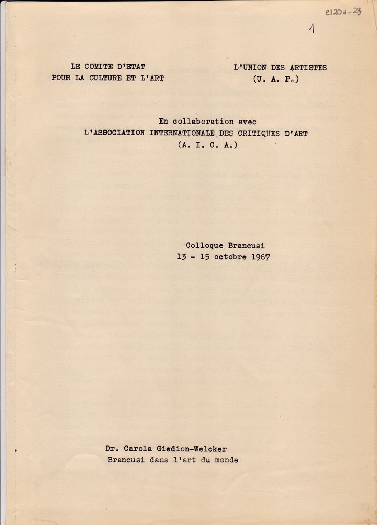 Δακτυλόγραφο κείμενο ανακοίνωσης της Carola Giedion Welcker, χαρτί, 7 φφ διπλής όψης, 29×20.5 εκ., στα γαλλικά, για τον Constantin Brancusi, στο πλαίσιο επετειακού συνεδρίου αφιερωμένου στον καλλιτέχνη, το οποίο πραγματοποιήθηκε στο Βουκουρέστι, με αφορμή τη συμπλήρωση 10 χρόνων από τον θάνατό του.