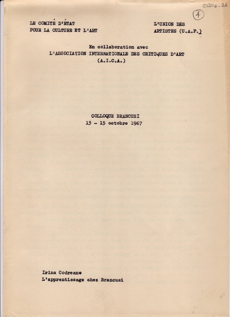 Δακτυλόγραφο κείμενο ανακοίνωσης της Irina Codreanu, χαρτί, 3 φφ, 29×21 εκ., στα γαλλικά, για την γλυπτική του Constantin Brancusi, στο πλαίσιο επετειακού συνεδρίου που πραγματοποιήθηκε στο Βουκουρέστι αφιερωμένου στον καλλιτέχνη, με αφορμή τη συμπλήρωση 10 χρόνων από τον θάνατό του.