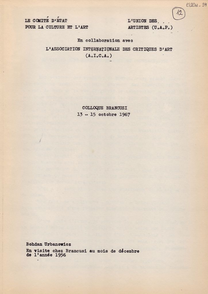 Δακτυλόγραφο κείμενο ανακοίνωσης του Bohdan Urbanowicz, χαρτί διπλής όψης, 3 φφ, 29×21 εκ., στα γαλλικά, αναφερόμενης στο ατελιέ του Constantin Brancusi, στο πλαίσιο επετειακού συνεδρίου αφιερωμένου στον καλλιτέχνη, το οποίο διεξάγεται στο Βουκουρέστι, με αφορμή τη συμπλήρωση 10 χρόνων από τον θάνατο του καλλιτέχνη.