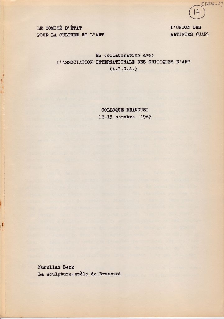 Δακτυλόγραφο κείμενο ανακοίνωσης του Nurullah Berk, χαρτί διπλής όψης, 29×21 εκ., στα γαλλικά, για τον Constantin Brancusi, στο πλαίσιο επετειακού συνεδρίου αφιερωμένου στον καλλιτέχνη, με αφορμή την συμπλήρωση 10 χρόνων από τον θάνατό του. Το συνέδριο πραγματοποιήθηκε στο Βουκουρέστι.