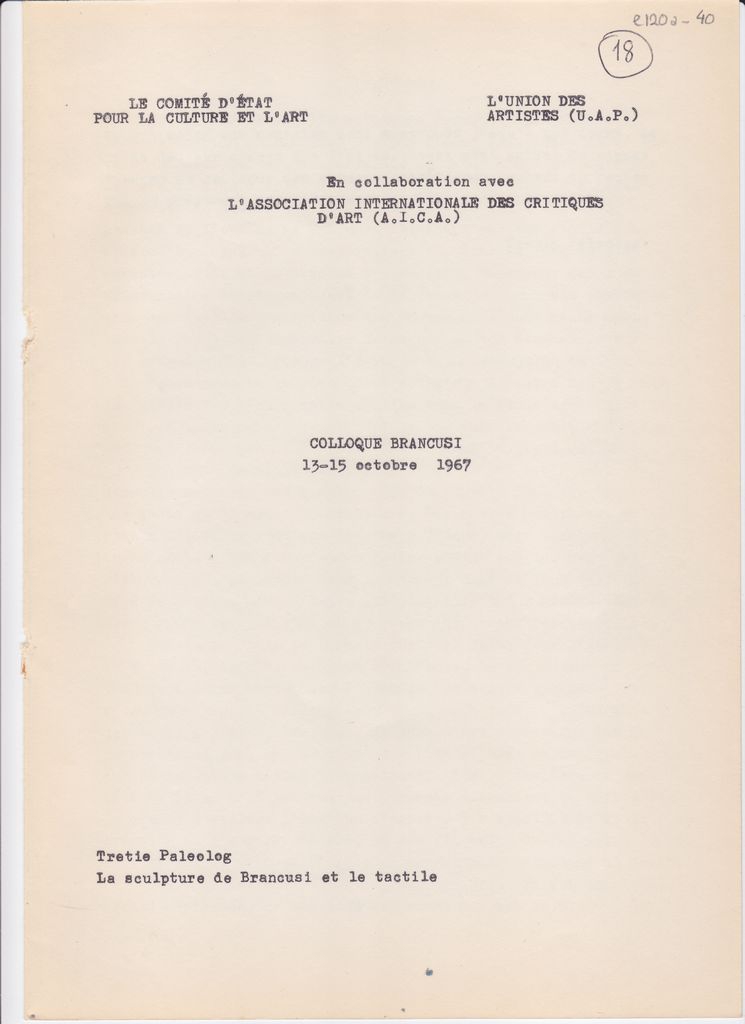 Δακτυλόγραφο κείμενο ανακοίνωσης του Tretie Paleolog, χαρτί διπλής όψης, 4 φφ, 29×21 εκ, στα γαλλικά, για τη γλυπτική του Constantin Brancusi, στο πλαίσιο επετειακού συνεδρίου, αφιερωμένου στον καλλιτέχνη με αφορμή τη συμπλήρωση 10 χρόνων από τον θάνατό του. Το συνέδριο πραγματοποιήθηκε στο Βουκουρέστι.