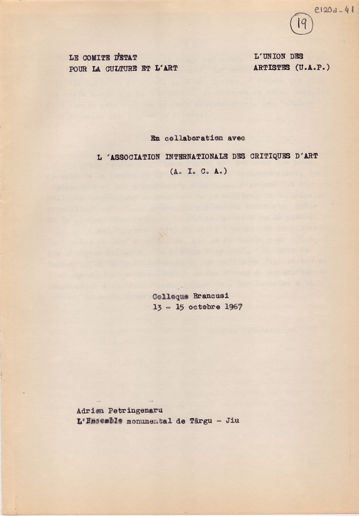 Δακτυλόγραφο κείμενο ανακοίνωσης του Adrien Petringenaru, χαρτί διπλής όψης, 5 φφ, 29×21 εκ., στα γαλλικά, με θέμα τα γλυπτά του Constantin Brancusi στην Targu-Jiu της Ρουμανίας. Η ανακοίνωση παρουσιάστηκε στο πλαίσιο επετειακού συνεδρίου αφιερωμένου στον καλλιτέχνη, με αφορμή τη συμπλήρωση 10 χρόνων από τον θάνατό του.