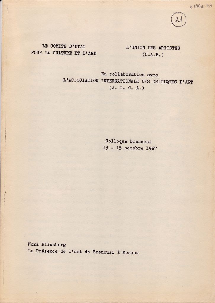 Δακτυλόγραφο κείμενο ανακοίνωσης της Nora Eliasberg, χαρτί διπλής όψης, 3 φφ, 29×21 εκ., στα γαλλικά, για τη γλυπτική του Constantin Brancusi, στο πλαίσιο επετειακού συνεδρίου αφιερωμένου στον καλλιτέχνη, με αφορμή τη συμπλήρωση 10 χρόνων από τον θάνατό του. Το συνέδριο πραγματοποιήθηκε στο Βουκουρέστι.