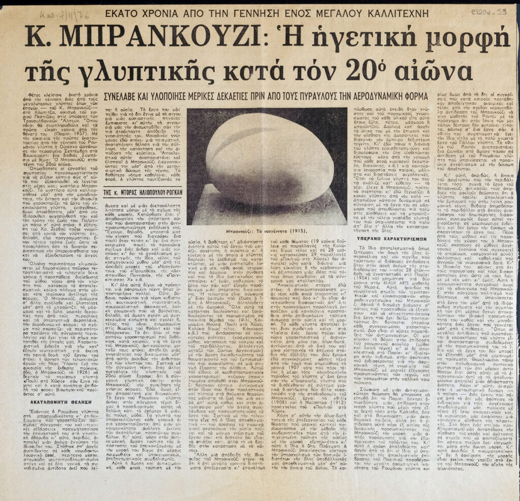 Απόκομμα, χαρτί, 32×32 εκ., στα ελληνικά, δημοσίευσης άρθρου αναφερόμενου στη γλυπτική του Constantin Brancusi.