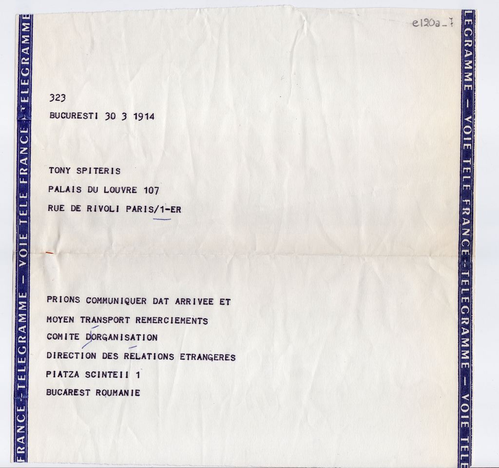 Τηλεγράφημα, χαρτί, 21×21 εκ., στα γαλλικά, απεσταλμένο από την οργανωτική επιτροπή του Συνεδρίου Brancusi προς τον Τώνη Σπητέρη, αναφορικά με την άφιξή του στο Βουκουρέστι, προκειμένου να παρευρεθεί στις εργασίες του.