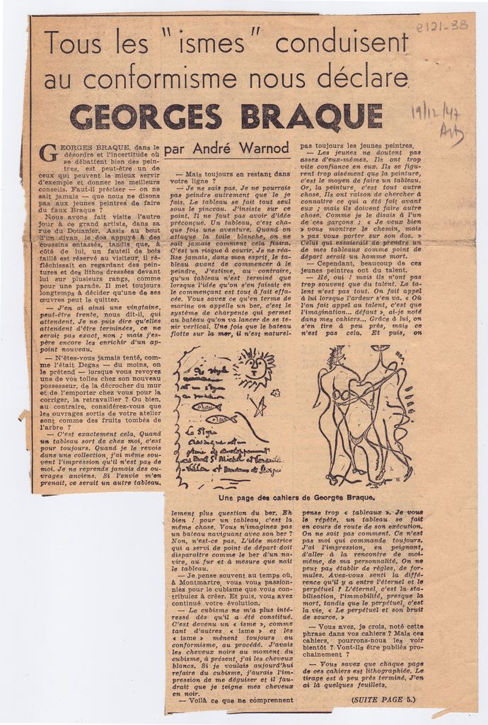 Απόκομμα, χαρτί, 2 φφ, ακανόνιστου μεγέθους και 16×5 εκ., στα γαλλικά, δημοσίευσης συνέντευξης του Georges Braque. Αναφέρεται στο εικαστικό του έργο και σε ζητήματα τέχνης.