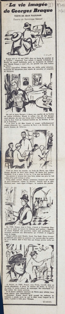 Απόκομμα, χαρτί, 56×12 εκ., στα γαλλικά, δημοσίευσης πρώτου μέρους αφιερώματος στον Georges Braque. Εξιστορείται η ζωή του καλλιτέχνη μέσα από κείμενο και σχέδια των Jean Paulhan και Dominique Gascuel.