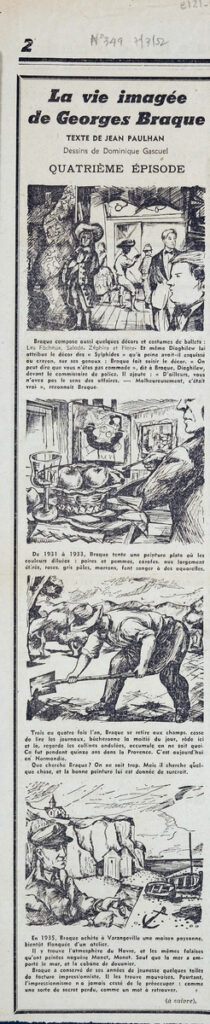 Απόκομμα, χαρτί, 50×12 εκ., στα γαλλικά, δημοσίευσης του τέταρτου μέρους αφιερώματος στον Georges Braque. Εξιστορείται η ζωή του καλλιτέχνη μέσα από κείμενο και σχέδια των Jean Paulhan και Dominique Gascuel.