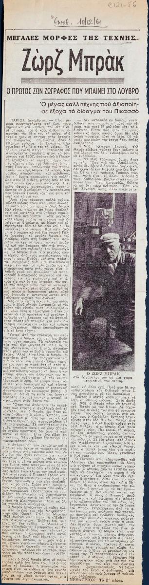Απόκομμα της εφημερίδας “Ελευθερία” (10/12/1961), όπου δημοσιεύεται άρθρο με θέμα το εικαστικό έργο του Georges Braque, με αφορμή αναδρομική έκθεση αφιερωμένη στον ίδιο, η οποία διοργανώνεται και διεξάγεται στο Λούβρο στο Παρίσι.