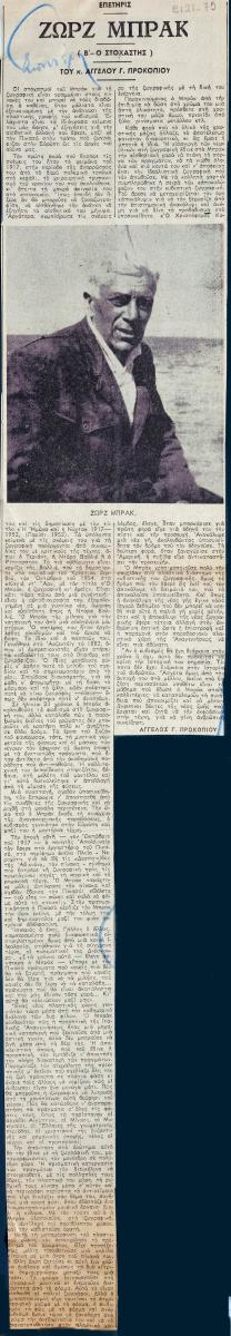 Απόκομμα της εφημερίδας “Η Καθημερινή” (27/10/1963), όπου δημοσιεύεται άρθρο αφιερωμένο στον Georges Braque. Σχολιάζεται η ζωγραφική του και η σχέση του με τον κυβισμό, ενώ γίνεται αναφορά στα τετράδιά του.