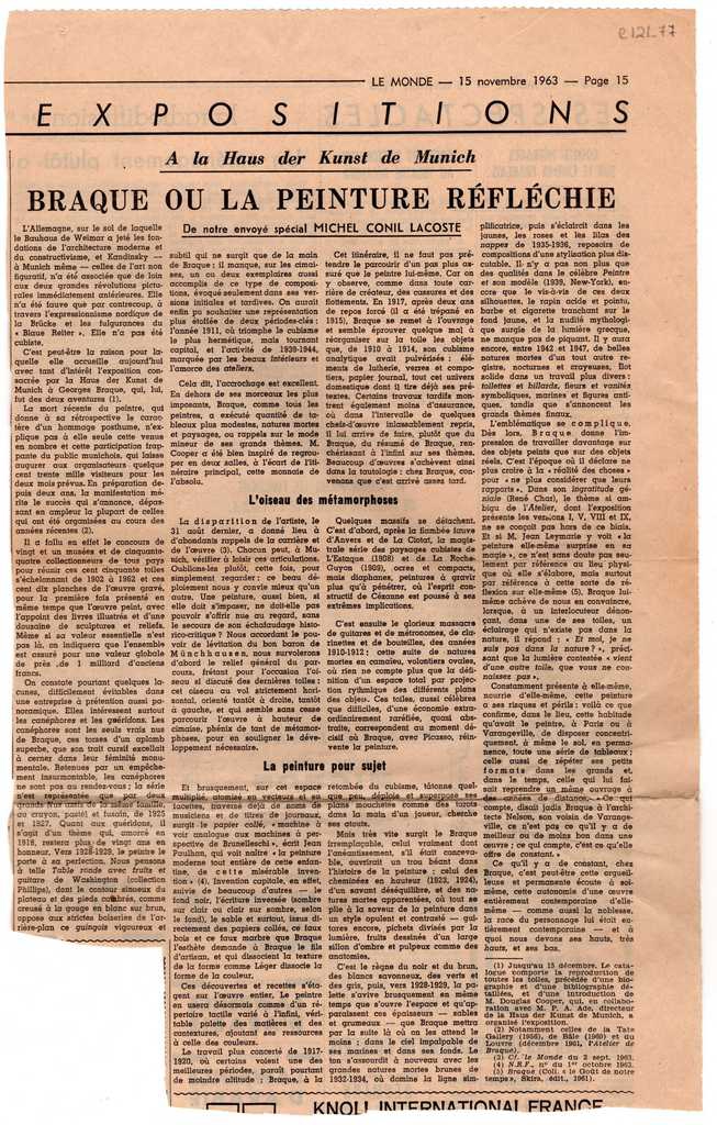 Απόκομμα, χαρτί ακανόνιστου μεγέθους, στα γαλλικά, δημοσίευσης κριτικής έκθεσης έργων του Georges Braque, η οποία διεξάγεται στο Μόναχο. Δίνονται πληροφορίες για τη διοργάνωση και τα έργα που παρουσιάζονται.