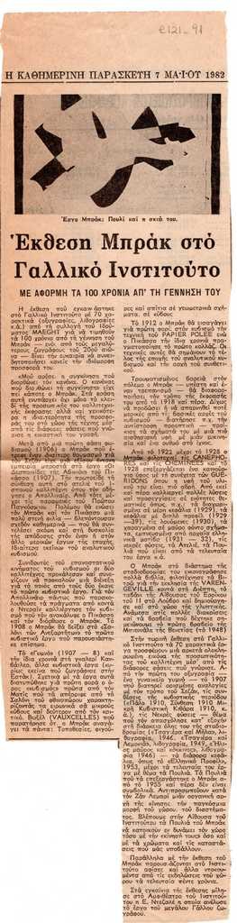Απόκομμα, χαρτί ακανόνιστου μεγέθους, στα ελληνικά, δημοσίευσης άρθρου το οποίο αναφέρεται σε αναδρομική έκθεση του Georges Braque, η οποία διεξάγεται στο Γαλλικό Ινστιτούτο Αθηνών.
