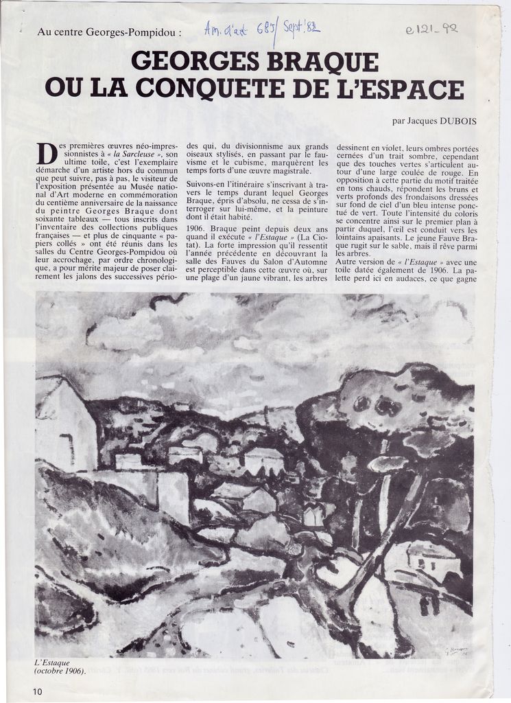 Απόκομμα, χαρτί, 3 φφ, 29,5×21 εκ., στα γαλλικά, δημοσίευσης κριτικής αναδρομικής έκθεσης έργων του Georges Braque στο Centre Pompidou στο Παρίσι. Αναγράφονται πληροφορίες για τα έργα που παρουσιάζονται.