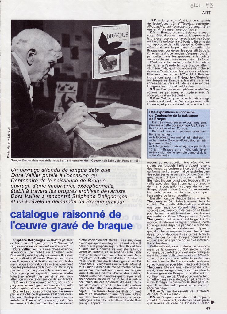Απόκομμα, χαρτί διπλής όψης, 29×21 εκ., στα γαλλικά, δημοσίευσης συνέντευξης της Dora Vallier για τον Georges Braque. Αφορμή για τη δημοσίευση, έκδοση βιβλίου της για τα χαρακτικά του καλλιτέχνη. Στο ίδιο, αναφορά σε εκθέσεις του καλλιτέχνη στο Μπορντώ και Παρίσι.