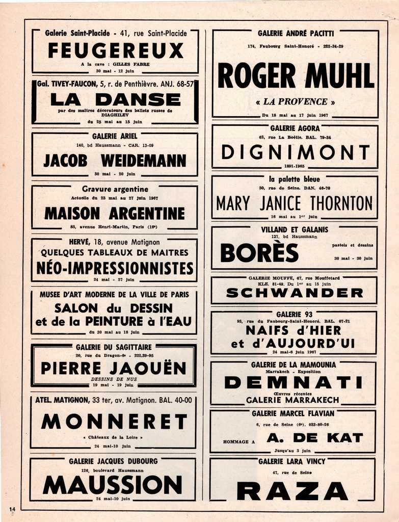 Απόκομμα, χαρτί, 27.5×21 εκ., στα γαλλικά, δημοσίευσης αναφορών σε εκθέσεις της περιόδου. Αναγράφονται αυτές των Feugereux, Weidemann, Jaouën, Monnert, Maussion, Muhl, Dignimont, Janice-Thornton, Schwander, Borès, Demnati, A. de Kat, Raza και ομαδικές.