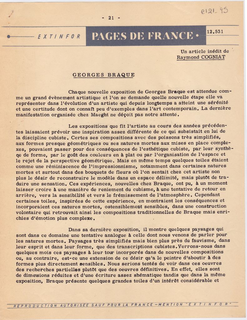 Δακτυλόγραφο αδημοσίευτο κείμενο, χαρτί, 3 φφ, 27×21 εκ., στα γαλλικά, για τον Georges Braque. Γράφηκε με αφορμή έκθεση έργων του καλλιτέχνη στην Galerie Maeght.