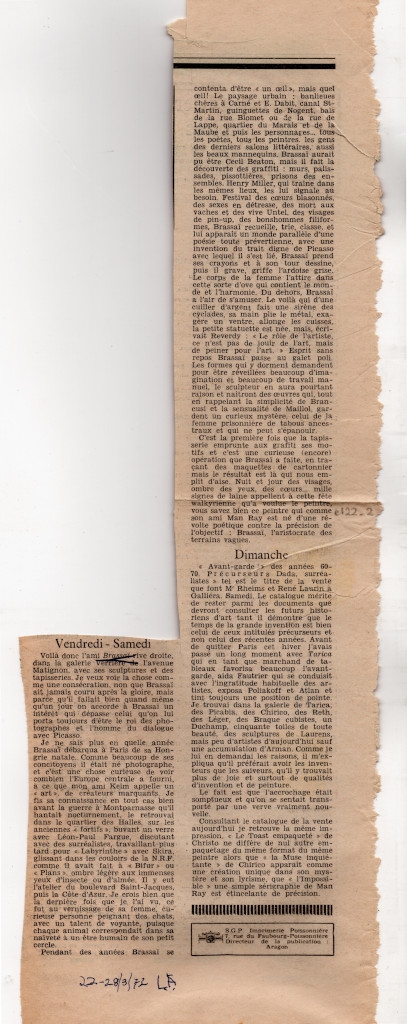 Απόκομμα, έντυπο, χαρτί, 43,0×14,0 εκ., όπου δημοσιεύεται, κριτική για την έκθεση έργων του εικαστικού καλλιτέχνη Brassaï στο Παρίσι το 1972. Στην ίδια σελίδα, δημοσίευμα για τη δημοπρασία έργων πρωτοπόρων καλλιτεχνών της δεκαετίας ’60-’70. Στην πίσω σελίδα, εκθεσιολόγιο της περιόδου (απόσπασμα).