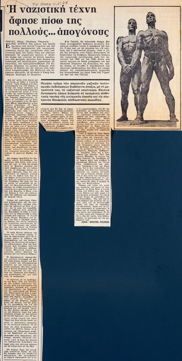 Απόκομμα της εφημερίδας “Το Βήμα” (11/05/1978), όπου δημοσιεύεται άρθρο με θέμα τις θέσεις του Arno Breker για τη ναζιστική τέχνη.