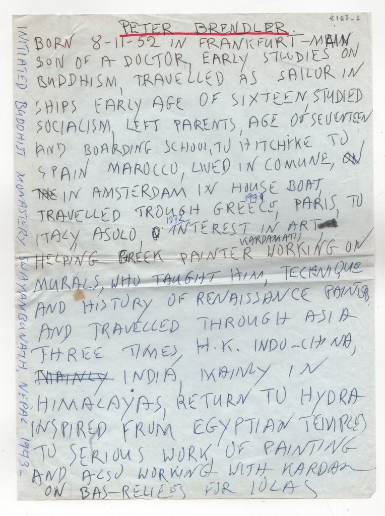 Χειρόγραφο βιογραφικό σημείωμα, χαρτί, 29×21 εκ., με μαύρο μελάνι στα αγγλικά, του Peter Brendler.