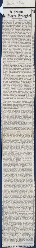 Απόκομμα, χαρτί, 48×6 εκ., στα γαλλικά, δημοσίευσης άρθρου αφιερωμένου στον Pieter Bruegel, με αφορμή έκθεση στην Orangerie στην οποία παρουσιάζονται έργα του, ανάμεσα σε άλλα. Σχολιάζεται η ζωγραφική του.