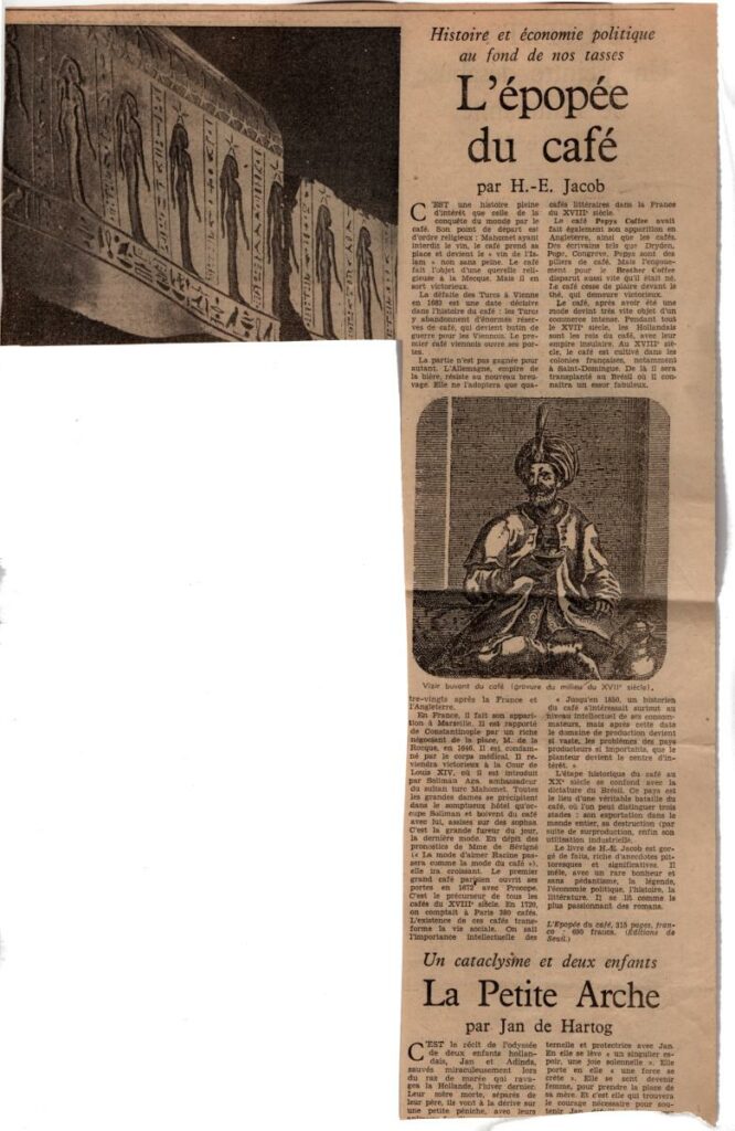 Απόκομμα, έντυπο, χαρτί, 40×25,5 εκ., όπου δημοσιεύεται, στα γαλλικά, βιβλιοκρισία για την έκδοση του H.-E. Jacob “L’épopée du cafe” σχετικά με τη διάδοση του καφέ στην Ευρώπη. Στην άλλη όψη, κριτική της ατομικής έκθεσης έργων του Bernard Buffet στο Παρίσι το 1954. Επάνω, επιγραφή με τα στοιχεία δημοσίευσης.