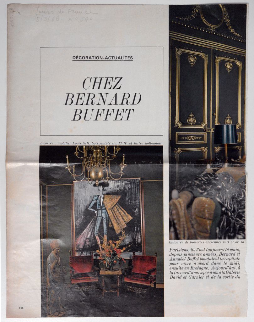 Απόκομμα, έντυπο, χαρτί ιλουστρασιόν, 2 φφ., 34,0×26,0 εκ., όπου δημοσιεύεται, στα γαλλικά, φωτογραφικό αφιέρωμα στην διακόσμηση της κατοικίας του ζεύγους Buffet στο Παρίσι από την εταιρία M.M. Léger, Lesage et Ramsay. Εντάσσεται στη στήλη “Décoration-Actualités”. Επάνω, επιγραφή με τα στοιχεία της δημοσίευσης.