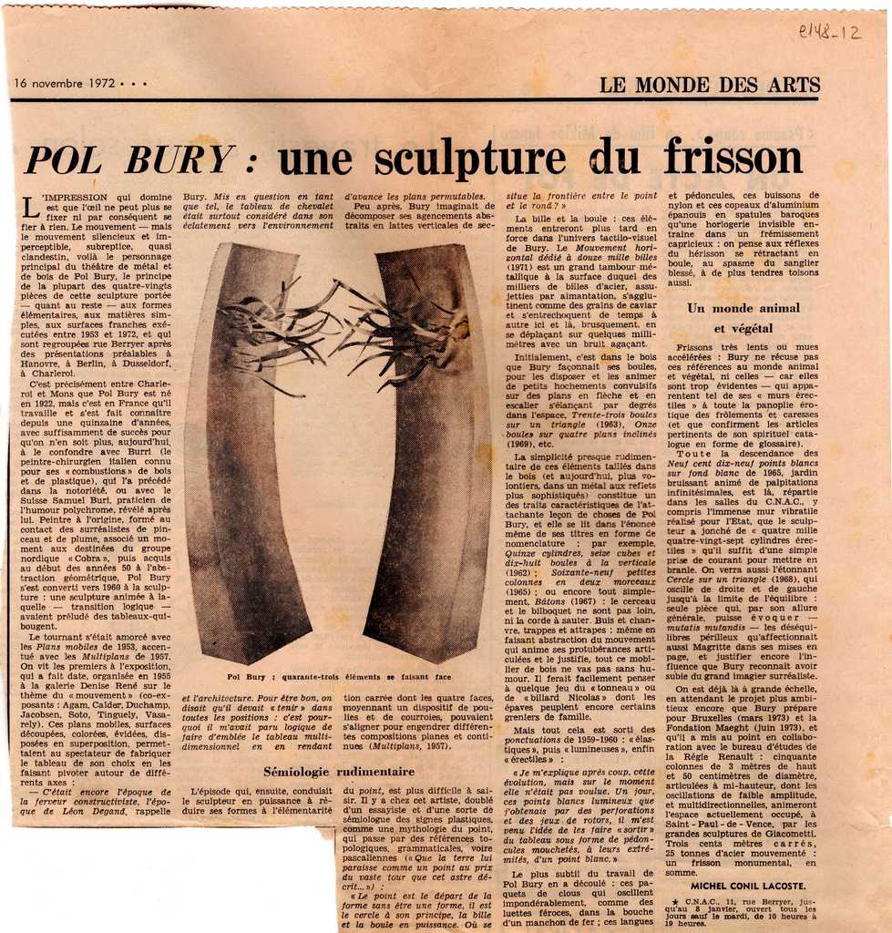 Απόκομμα, χαρτί ακανόνιστου μεγέθους, στα γαλλικά, δημοσίευσης κριτικής έκθεσης του Pol Bury, η οποία διεξάγεται στo C. N. A. C. στο Παρίσι.