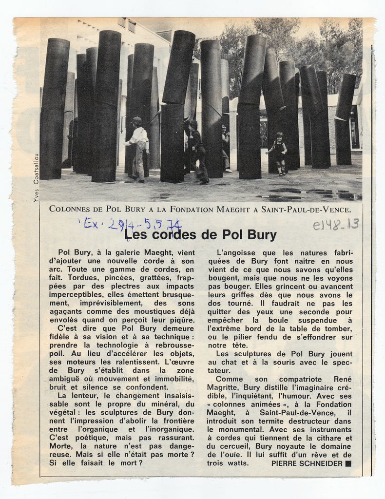Απόκομμα, χαρτί, 16,5×13 εκ., στα γαλλικά, δημοσίευσης κριτικής έκθεσης του Pol Bury, η οποία διεξάγεται στην Galerie Maeght στο Παρίσι.