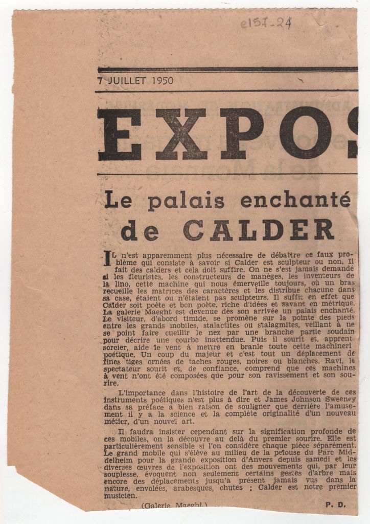 Απόκομμα, χαρτί, 19×13 εκ., στα γαλλικά, δημοσίευσης κριτικής έκθεσης του Alexander Calder, στην Galerie Maeght στο Παρίσι.