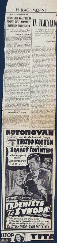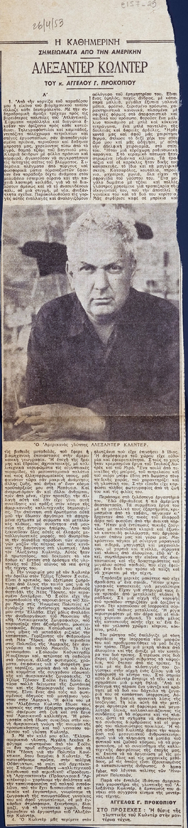 Απόκομμα, χαρτί, 46×10 εκ., στα ελληνικά, δημοσίευσης κειμένου του Άγγελου Προκοπίου στο οποίο αναφέρεται στην γνωριμία του με τον Alexander Calder και αναγράφει σχόλια για έργα του.