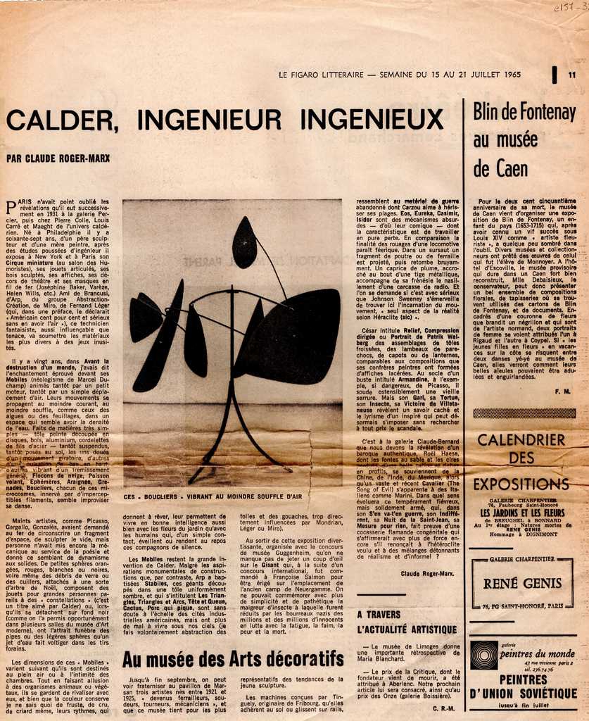Απόκομμα, χαρτί, 36×30 εκ., στα γαλλικά, δημοσίευσης άρθρου το οποίο αναφέρεται στην γλυπτική του Alexander Calder, με αφορμή έκθεση του καλλιτέχνη στο Παρίσι. Σχολιάζονται έργα μηχανικής τέχνης. Στο ίδιο, “Au musée des Arts décoratifs”, κριτική ομαδικής έκθεσης μηχανικής τέχνης και τέλος, αναφορά σε έκθεση του Roël de Haese στην Galerie Claude Bernard.